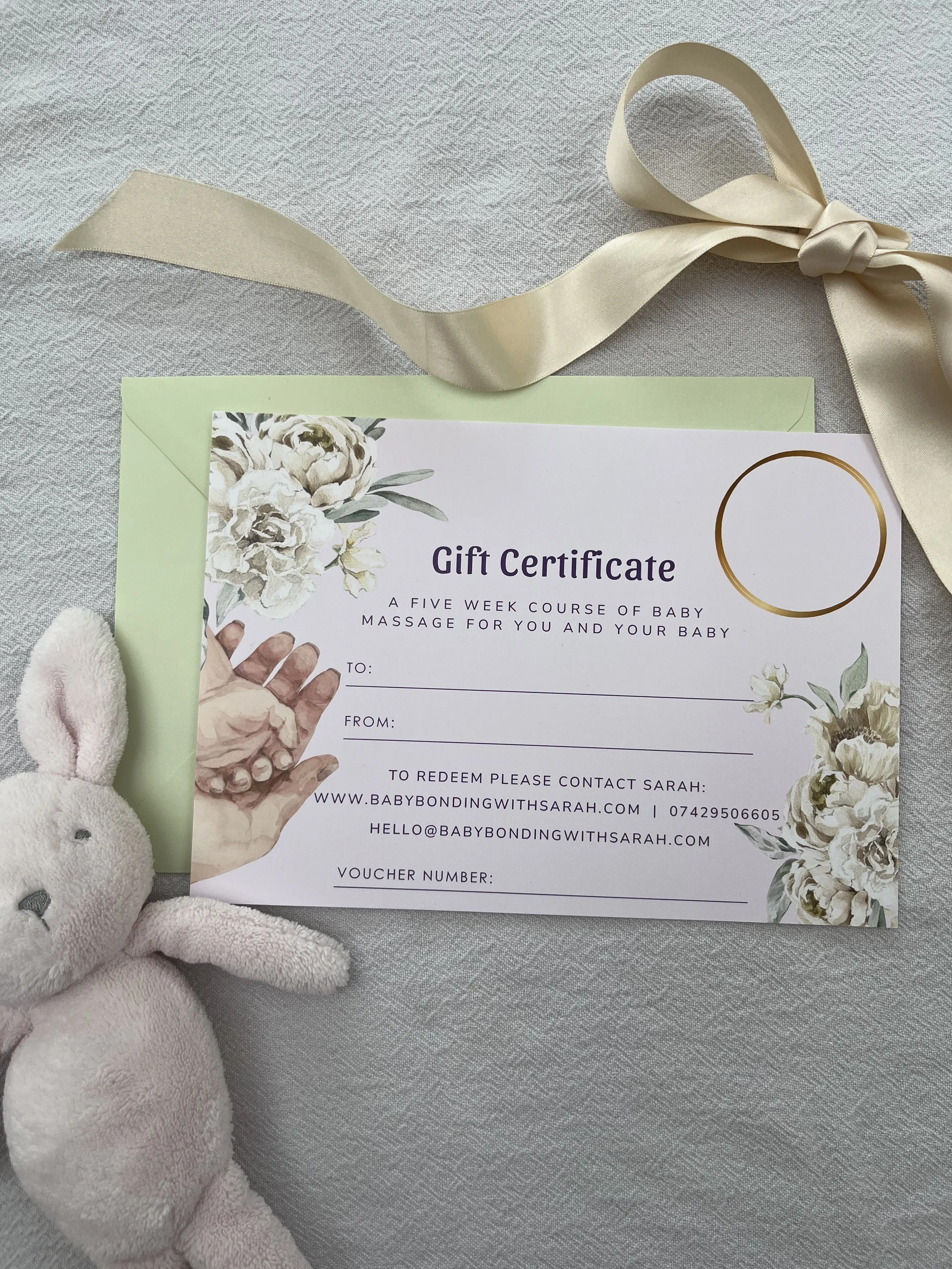 A wonderful gift for a mum-to-be or a new parent. Our Baby Massage Gift Certificates are a thoughtful way to support a new mum. Ideal for baby showers or new arrivals.